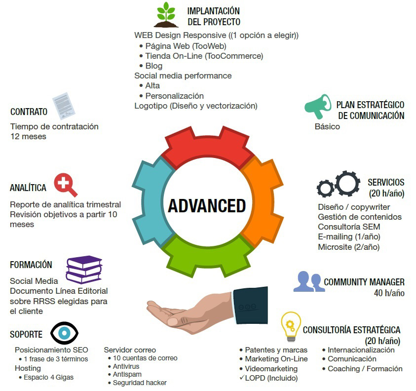 Es un completo conjunto de herramientas y protocolos orientados a aumentar su popularidad y difusión por Internet a través de estrategias, desarrollo, posicionamiento, marketing, social media (Facebook, Twitter, etc.), Landing Pages o Microsites, con una marcada intención de captar nuevos negocios, fidelizar clientes y la venta de productos. La frecuencia, intensidad y recursos aplicados dependerá del plan estratégico de Comunicación contratado (PYME, ADVANCED, PREMIUM, POLITICS, AD HOC) y de la naturaleza de su negocio.