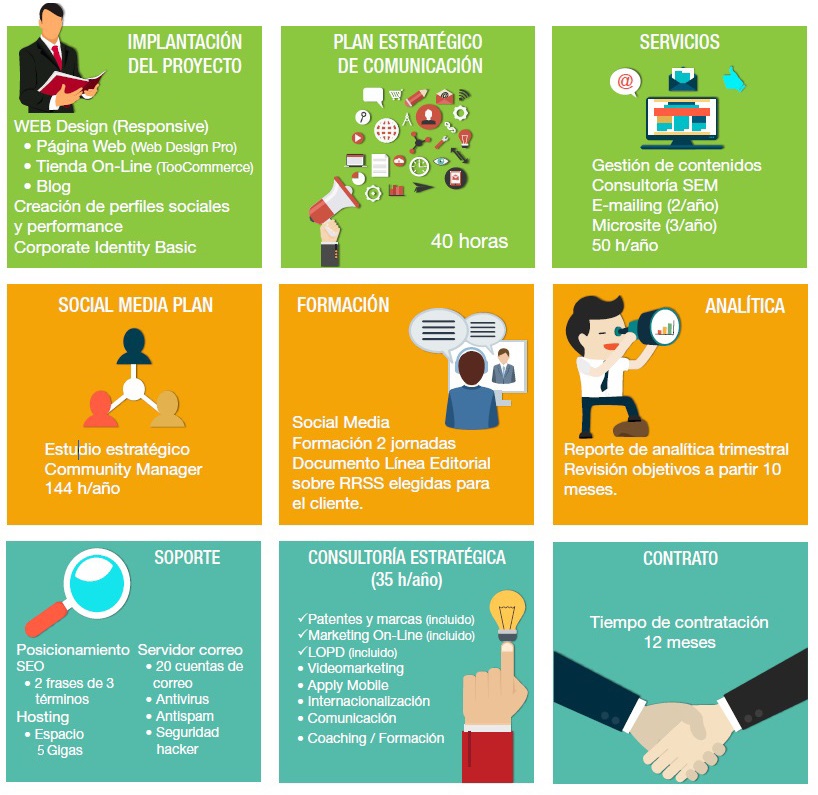 - Se incluyen 20 horas al año para realizar Asesoramiento Consultivo sobre aspectos legales de Patentes y Marcas, Marketing Online, VideoMarketing, y formación.