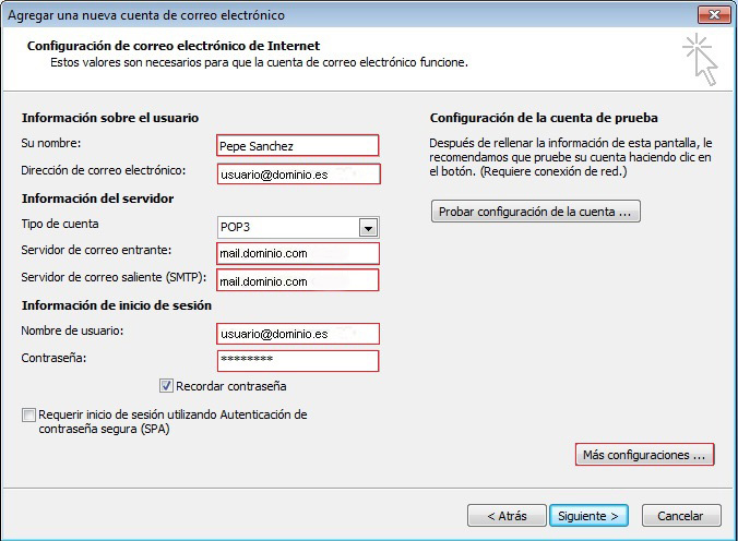 Tras darle a Aceptar, regresará a la ventana de Configuración de correo electrónico por Internet: