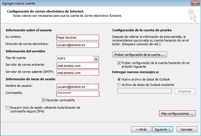 Regresamos a la ventana Configuración de correo electrónico de Internet y le damos a Siguiente: