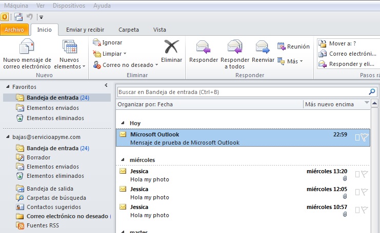 Se nos informa que la configuración de cuenta de correo electrónico se ha procesado con éxito y le damos a Finalizar para poder empezar a usar nuestra nueva cuenta en Outlook 2010: