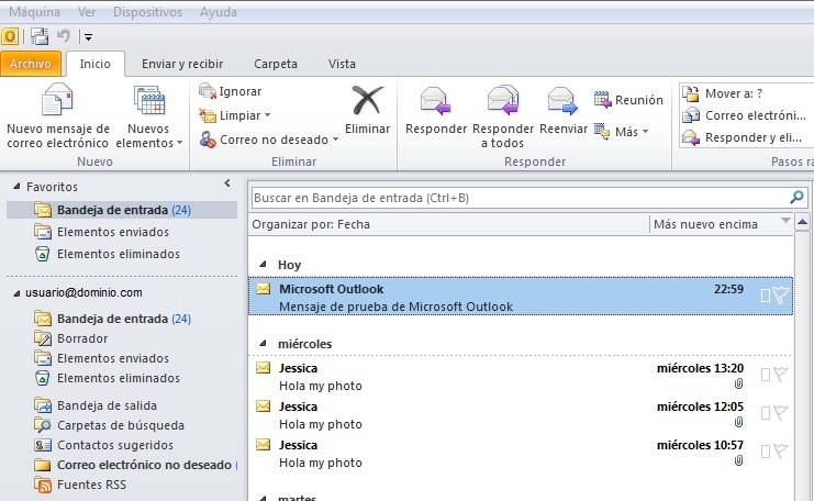 Se nos informa que la configuración de cuenta de correo electrónico se ha procesado con éxito y le damos a Finalizar para poder empezar a usar nuestra nueva cuenta en Outlook 2010: