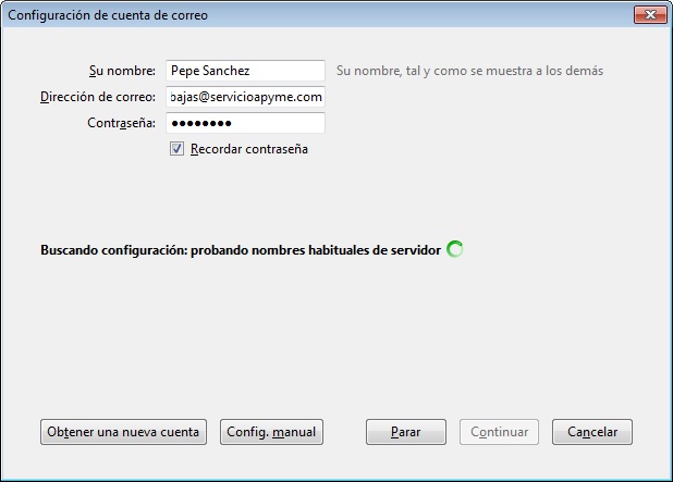 Tras darle a Continuar, Thunderbird sugerirá unos parámetros de configuración. Ignórelos y pinche en Config. manual. Continue por el Paso 5: