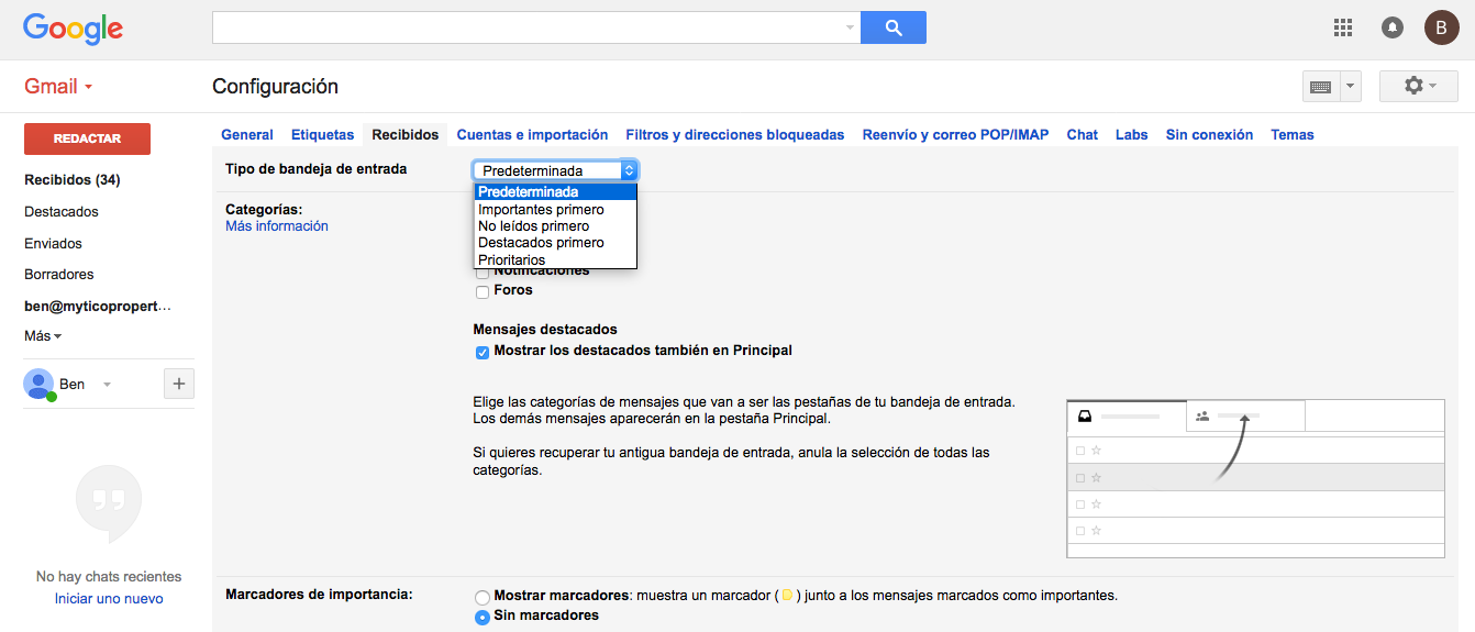 - En la 1ºLinea leemos Tipo de bandeja de entrada, desplegar las opciones y marcar la opción No leidos primero.