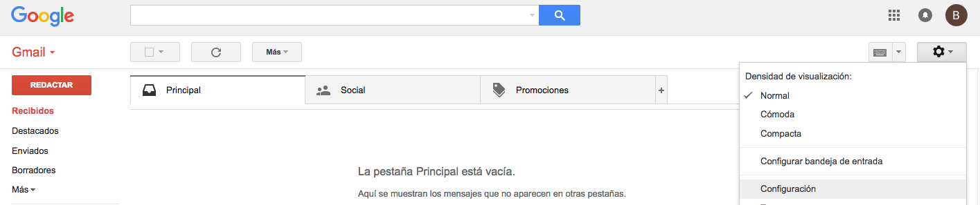 - Una vez hemos accedido al correo del usuario creado en la pantalla principal de Gmail veremos en la zona superior derecha un icono de rueda dentada. Despliegue y haga clic en Configuración.