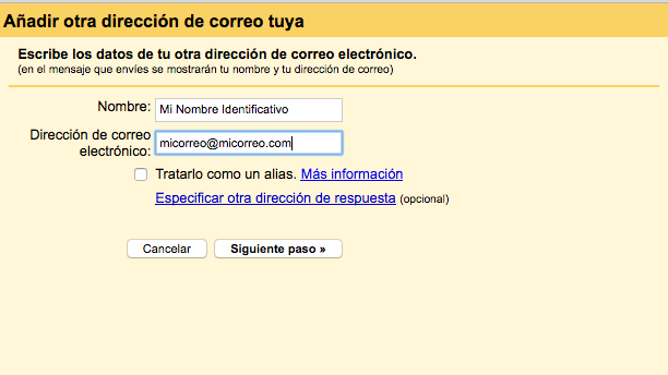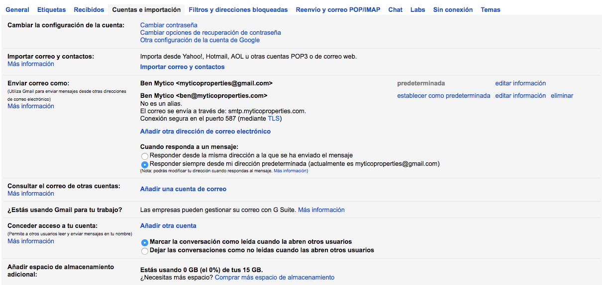 - Dentro de esta pestaña vamos a la linea nº3 llamado Enviar correo como, verá que ya aparece el nombre del correo que utiliza en gmail. Vamos a añadir una nueva cuenta de correo.