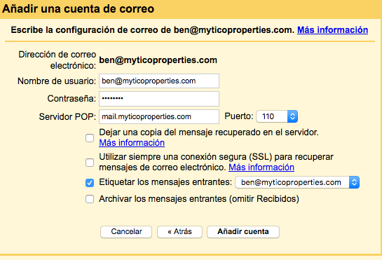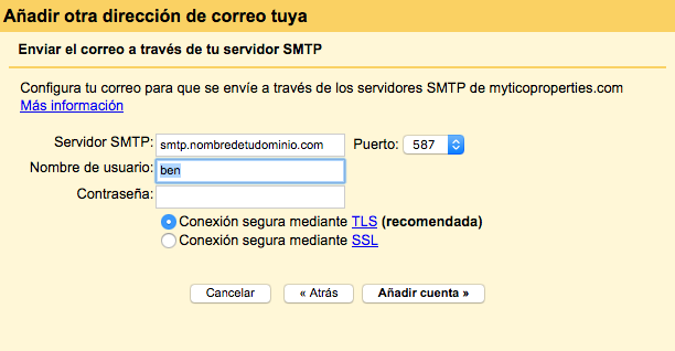 Esta configuración es recomendada actualmente debido a lo extendido del uso de los correos de gmail, seguro que usted dispone de un correo de gmail que utiliza de forma privada o para recibir esporádicamente algún correo. Pues bien en esa cuenta pueden convivir tantas cuentas de correo electrónico dispongamos, sin que ello afecte al comportamiento de la herramienta al contrario dispondrá de las siguientes ventajas.