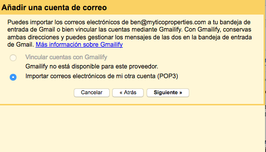 - Es posible que una vez haga clic en siguiente le aparezca una nueva ventana para que seleccione una de las opciones que le ofrezca. Siempre elegir Importar correos electronicos de mi otra cuenta (POP3) según la siguiente imagen.