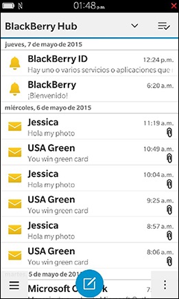 Una vez agregada la cuenta, regrese al escritorio y luego abra el Blackberry Hub para ver sus mensajes:
