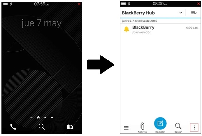 En el escritorio, deslice el dedo hacia la derecha para acceder al Blackberry Hub. Una vez acceda, pulse sobre los 3 puntos en vertical en la esquina inferior derecha.