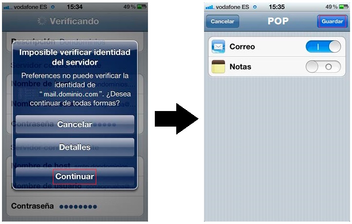Ahora, iOS procederá a verificar los datos insertados. No importa si el proceso de verificación falla, simplemente dele a Continuar (este proceso se hará 2 veces, una para el servidor de entrada y otra para el de salida), tras lo cual dele a Guardar: