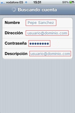 En esta sección tiene que especificar el nombre de la persona que quiere que aparezca al enviar correos, así como la dirección de correo, la contraseña y una descripción. Como descripción, si no se le ocurre nada, puede poner la dirección de correo, por ejemplo: