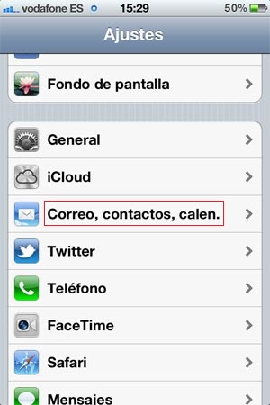 Dentro de Ajustes, seleccione la opción Correo, contactos, calend.: