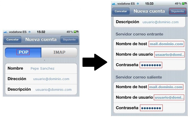 En esta sección escoja la opción POP para el servidor de entrada. Además ha de especificar tanto para el servidor de entrada como para el de salida: