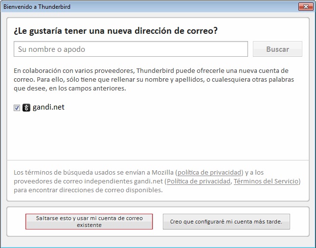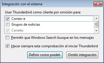 Al usar Mozilla Thunderbird por primera vez le aparecerá la ventana Integración con el sistema. Escoja la opción que prefiera: