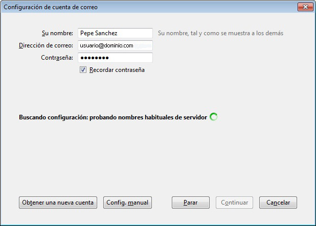 Tras darle a Continuar, Thunderbird sugerirá los parámetros de configuración. Ignórelos y pinche en Config. manual: