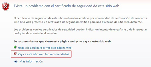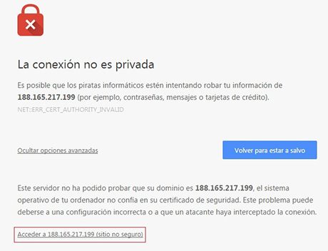 Al acceder por primera vez a la URL del panel de control, le aparecerá un aviso sobre el certificado de