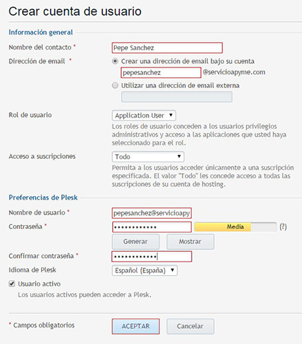 - Después rellene al menos los campos obligatorios. Cuando haya acabado dele a Aceptar:
