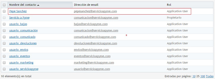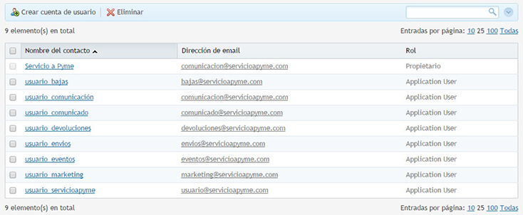 En este apartado, se le mostrará una lista con el nombre y dirección de correo electrónico de todos los usuarios existentes en su cuenta de panel de control Hosting. Además podrá crear usuarios nuevos o borrar aquellos existentes.