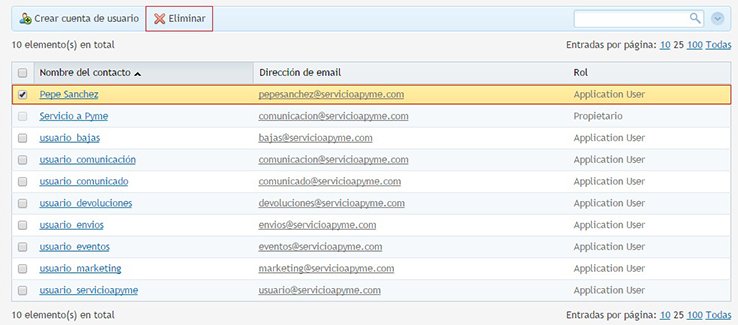 - Marque la casilla correspondiente al usuario que quiere borrar y dele a Eliminar: