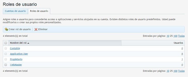 En este apartado se le muestran los posibles roles y el numero de usuarios a los que cada rol ha sido asignado. Además, usted puede crear roles nuevos o borrar aquellos existentes: