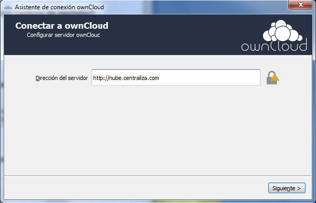 - En las siguientes ventanas le solicitará la dirección donde debe conectarse http://nube.centraliza (tal cual está escrito en la imagen). Una vez introducido haga clic en botón siguiente e introduzca su usuario y contraseña que previamente habrá recibido por correo electrónico.