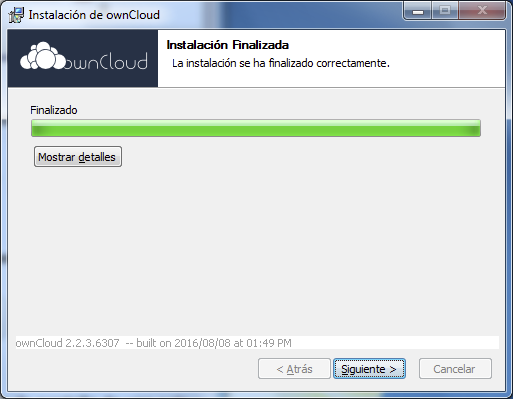 - Una vez finalizada la instalación haga click en botón siguiente.