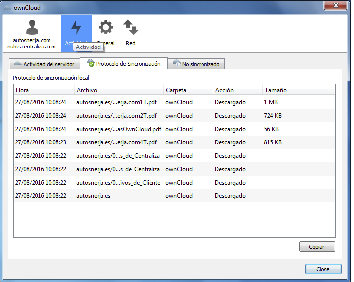 - En el botón que se llama Actividad visualizará los archivos que se han ido sincronizando,descargando o no sincronizado.