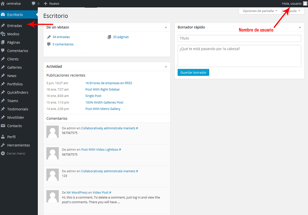 Una vez hemos entrado en nuestro blog o web con la dirección que centraliza ha proporcionado, por ejemplo: nombredesuweb/wp-admin entraremos en nuestro panel de administración de la página, que nos pedirá los datos de nombre de usuario y contraseña.