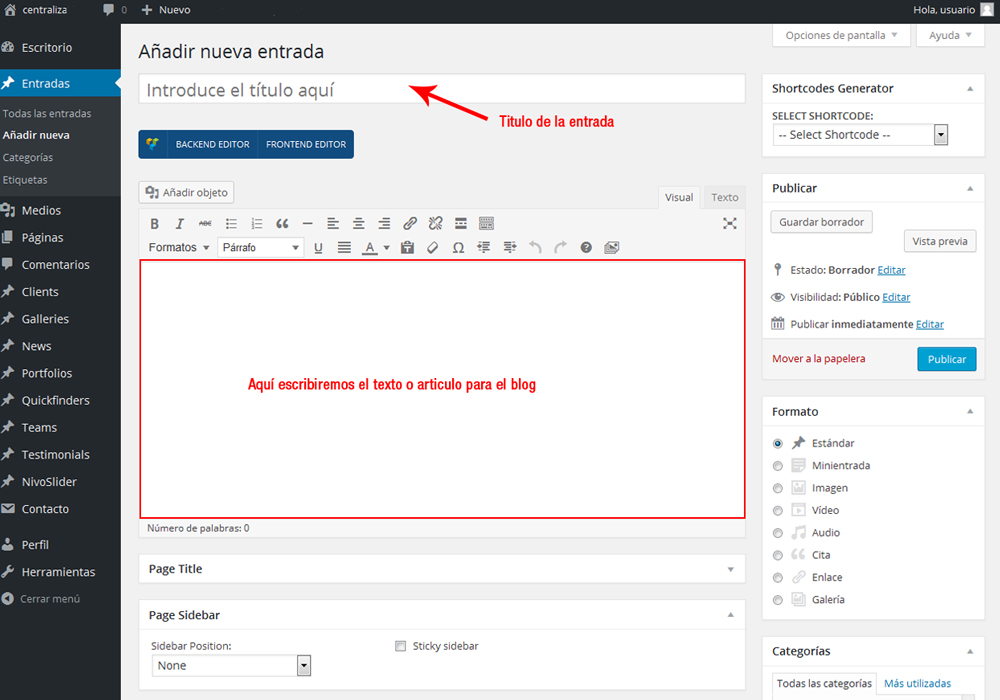 Para introducir las entradas en nuestro blog hacemos click en el menú lateral izquierdo en la categoría entradas. Nos aparecen 3 opciones diferentes, hacemos click en añadir nueva. Se nos abre una página en la que aparece la página para publicar el artículo.