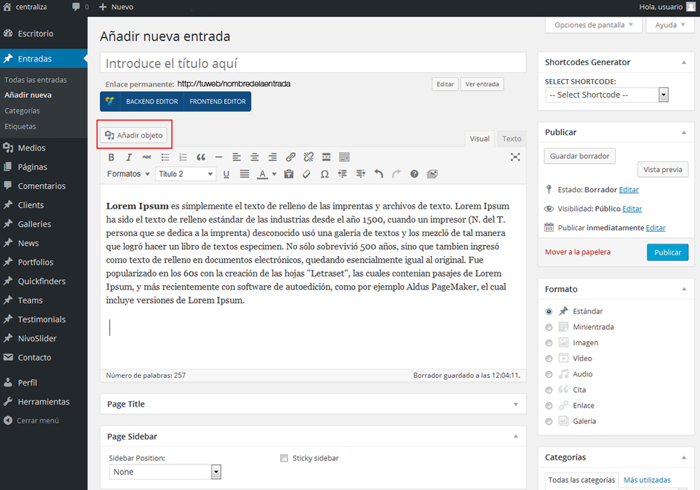 Una vez escrito todo el contenido podríamos añadir tanto un archivo de imagen (jpg, png) como un vídeo a nuestro artículo haciendo click en añadir objeto, en la parte superior del cuadro de texto: