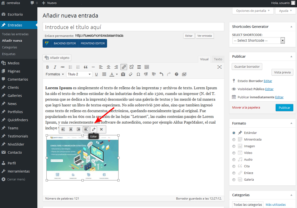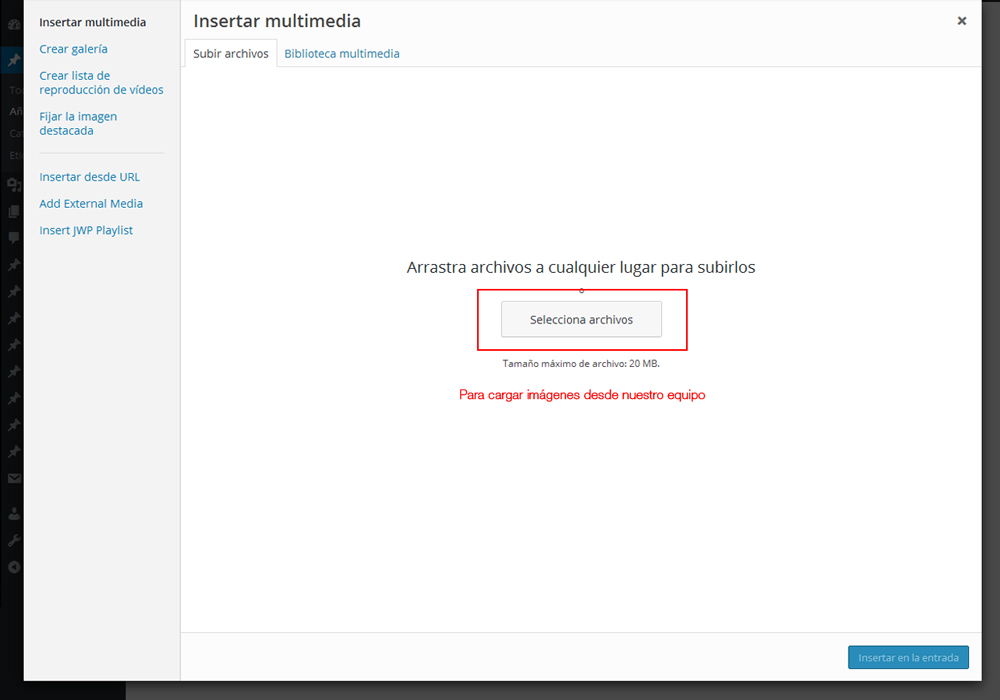 2.Cargar una imagen que tenga la Biblioteca multimedia, las que están en la web subidas (una vez hayamos subido las fotos se quedan almacenadas en esta sección)