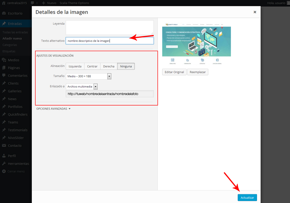 Configurada la imagen a nuestro gusto y en el apartado, texto alternativo, pondremos un texto descriptivo de la imagen, una vez hecho esto, haremos click en actualizar para que nuestros cambios en la imagen se guarden.