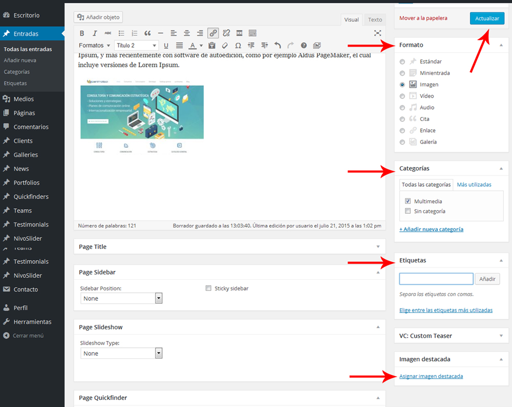 Si quisiéramos asignar una imagen destacada a nuestra entrada de blog para hacer el contenido más visual, haremos click en Asignar imagen destacada para asignarla (las opciones que se abren son las mismas que las que hemos comentado anteriormente).